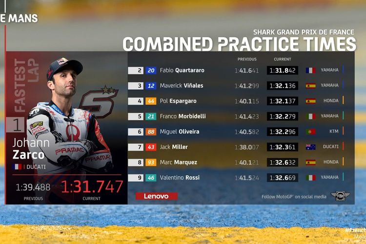 Pembalap tim Pramac Racing, Johann Zarco menjadi yang tercepat pada FP2 MotoGP Prancis 2021. Ungguli Fabio Quartararo di detik terakhir