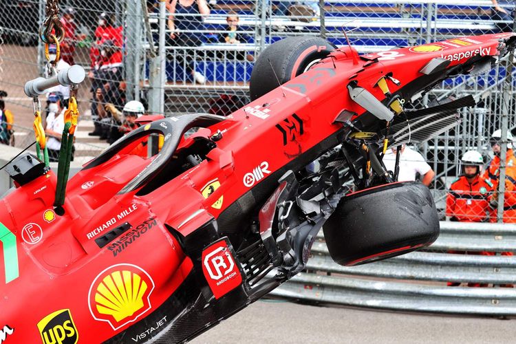 Mobil Ferrari SF21 rusak parah akibat kecelakaan, Charles Leclerc bisa kena penalti dan kehilangan pole position di f1 Monako 2021.