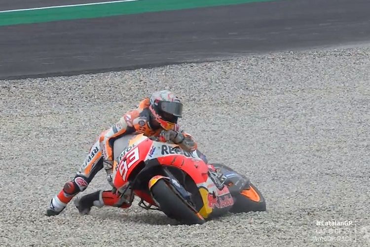 Pembalap tim Repsol Honda, Marc Marquez tetap senang meski tidak berhasil menyelesaikan MotoGP Catalunya 2021 di sirkuit Barcelona.