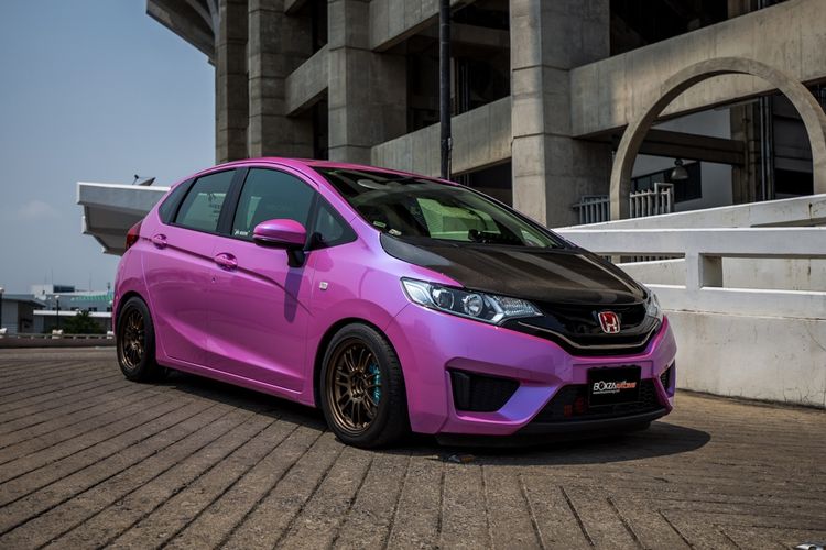 Modifikasi Honda Jazz GK5 percaya diri tampil nyentrik dibalut warna yang lain daripada yang lain plus tongkrongan sporty