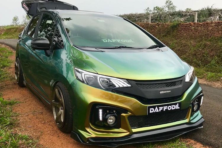 Modifikasi Honda Jazz GK5 tampil eye-catching dan unik dibungkus warna bunglon, plus aplikasi body kit Mugen dan suspensi udara