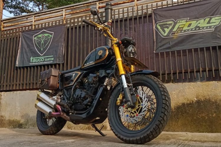 Scrambler sangar berbasis Yamaha Scorpio, bukan cuma bodi, sektor kaki-kaki juga diupgrade tampil garang berkat pelek dan ban dual purpose