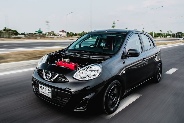 Modifikasi Nissan March warna hitam asal Thailand ini sah tampil racing. Jantung ganti mesin K24 milik Honda power kini 200 dk.