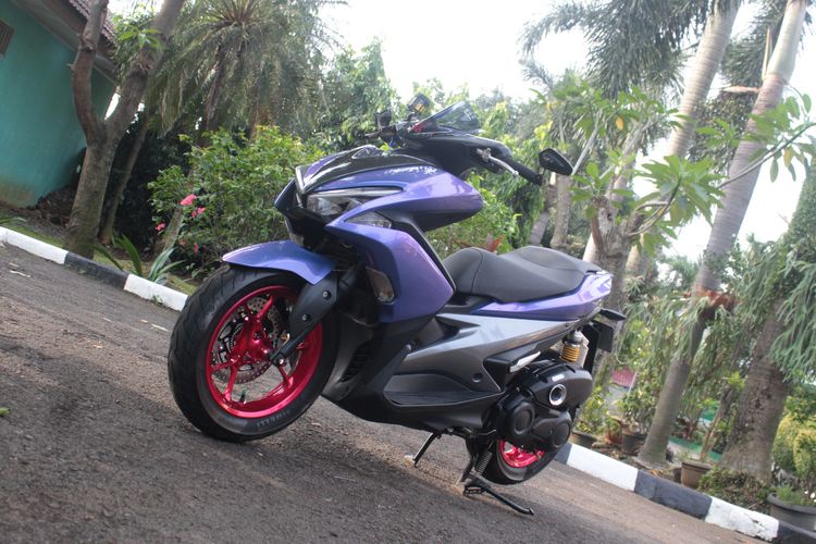 bukan motor cewek, yamaha aerox ini punya paduan warna bodi unik dengan repaint biru lembayung dan gunmetal serta merah candy