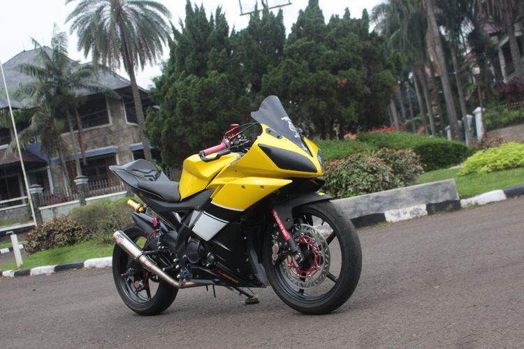 modifikasi Yamaha R15 berpakem street race dipenuhi berbagai part racing hedon yaitu kaliper rem Brembo sokberker Ride IT GP Series dan lainnya