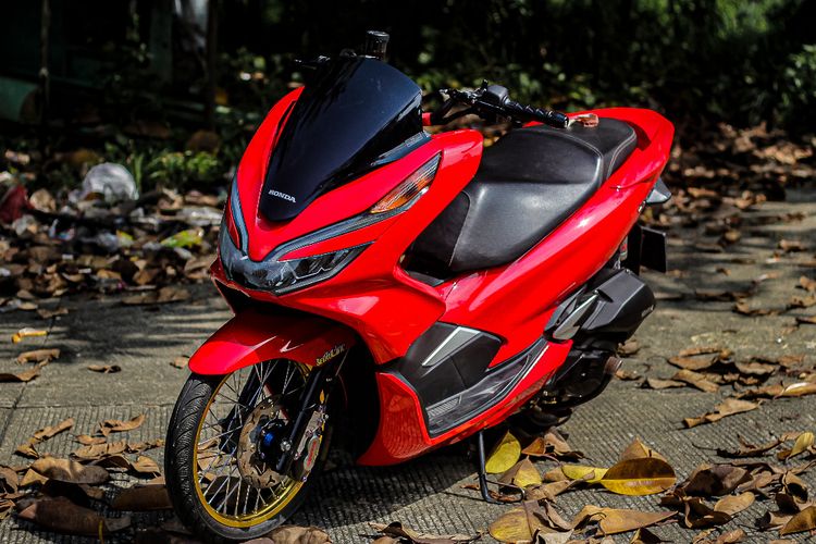 Modifikasi Honda PCX 150, bodinya repaint merah glowing dikombo kaki-kaki oke ring 16 jari-jari dengan ban tebal