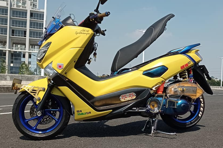Modifikasi Yamaha NMAX glowing berjubah kuning, nyentrik dikombo aksesori unik seperti cover filter transparan, repaint kaki-kaki biru lembayung