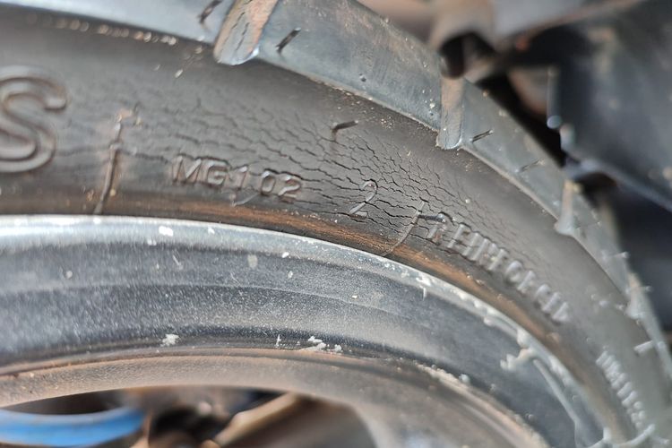 Tips beli motor bekas, ban motor saatnya diganti baru kalau sudah ada keretakan, benjol dan banyak bekas tambalan.