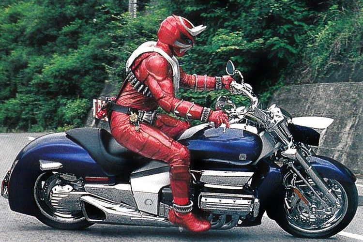 Beda dari Belalang Tempur, Kamen rider satu ini justru pakai Hampir-Davidson Honda sebagai tunggangannya. Mesinnya sama kayak Honda Gold Wing lo.