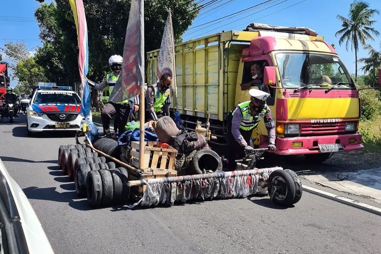 Satlantas Polres Boyolali yang kendarai Vespa modifikasi extreme di Jalan Solo-Semarang viral di Instagram, Sabtu (28/08).