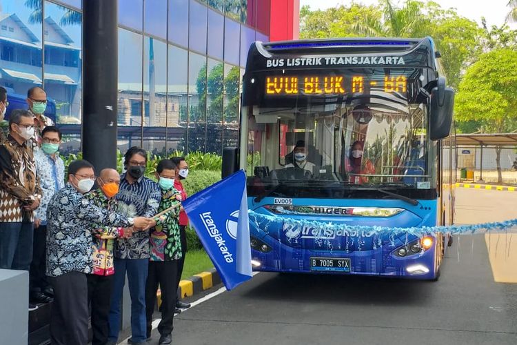 PT Transportasi Jakarta (TransJakarta) lakukan pelepasan uji coba bus listrik Higer selama tiga bulan dengan rute Blok M - Balaikota.