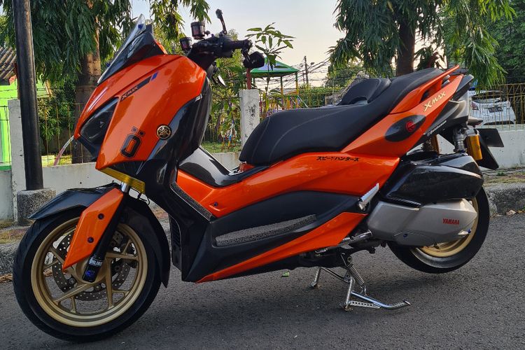 Yamaha XMAX oranye makin menarik, berdiri di atas kaki-kaki modif ganti sokbreker Ohlins, pengereman full Brembo