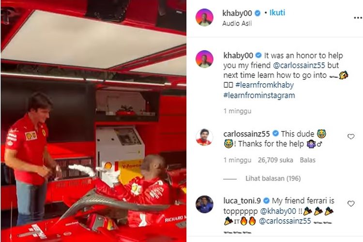 Pembalap tim Ferrari, Carlos Sainz lupa cara masuk mobil. Khaby Lame turun langsung mengajari caranya