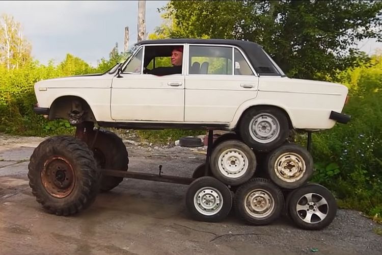 Channel YouTube Garage 54 asal Rusia kembali bikin modifikasi ektrem. Kali ini sedan lawas Lada dibikin jangkung pakai 14 roda sekaligus