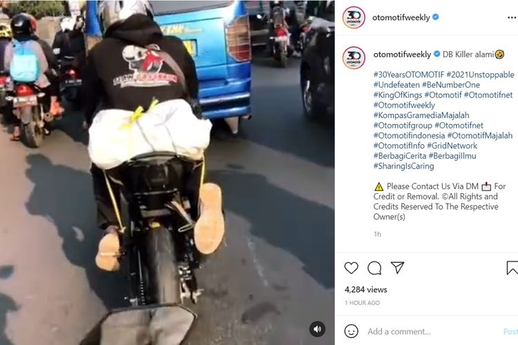 Pengendara motor ini gunakan kakinya untuk menutup knalpot agar suaranya tak berisik. Jadi DB Killer alami