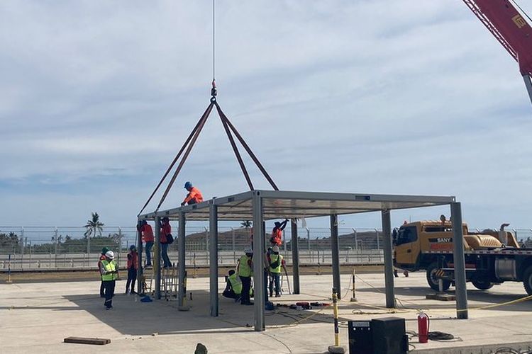 Proses pemasangan pit building modular sirkuit Mandalika yang dikabarkan akan memiliki 50 ruang mulai dikerjakan.