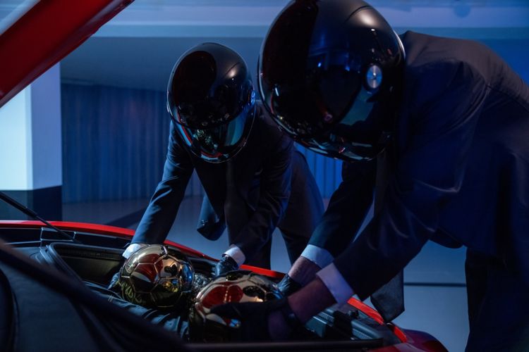 Fernando Alonso dan Esteban Ocon mengantar piala Ballon d'Or 2021 yang dimenangkan Lionel Messi, pake helm segala bawanya.
