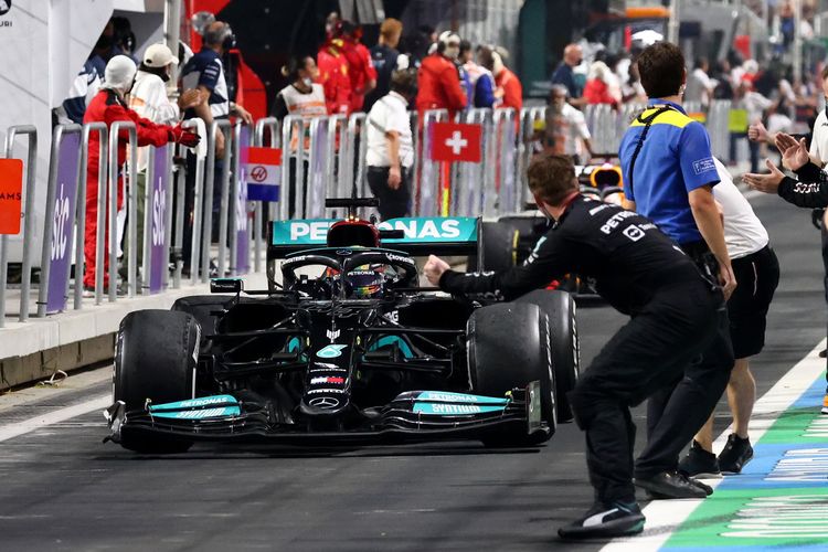 Balap F1 Arab Saudi 2021 yang dipenuhi drama, membuat Lewis Hamilton khawatir tim Mercedes salah strategi.