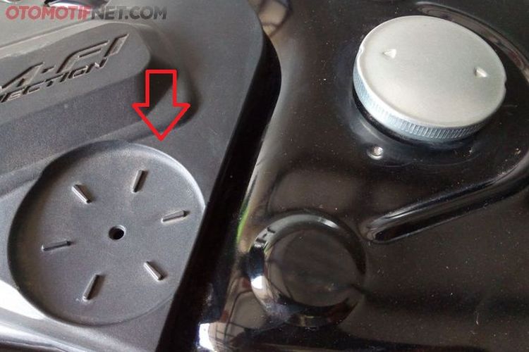 Terbilang sepele tapi berguna, coakan yang terdapat dekat tutup tangki bensin di motor Honda Revo FI berfungsi untuk meletakkan tutup tangki.