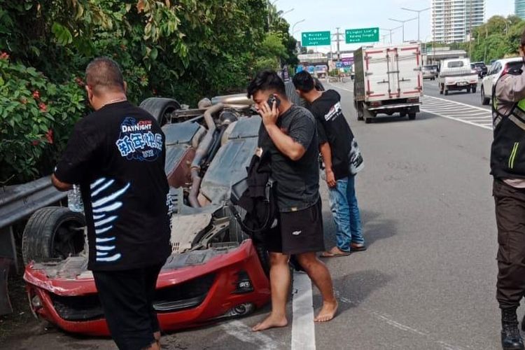 Sebuah mobil terbalik di Tol Jakarta-Tangerang (Janger) Meruya KM 05+500 arah Karang Tengah, Jakarta Barat pada pukul 08.50, Minggu (23/1/2022)..