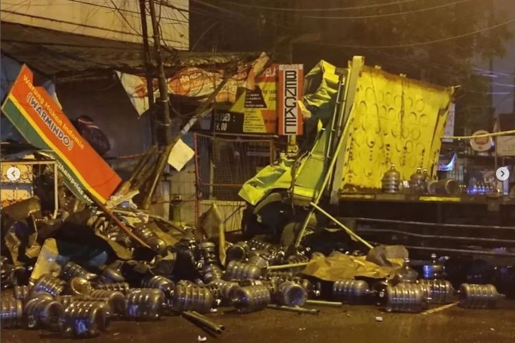 Kecelakaan maut di Jalan Cihampelas Kota Bandung membuat bodi angkutan kota terbelah hingga galon air berserakan.