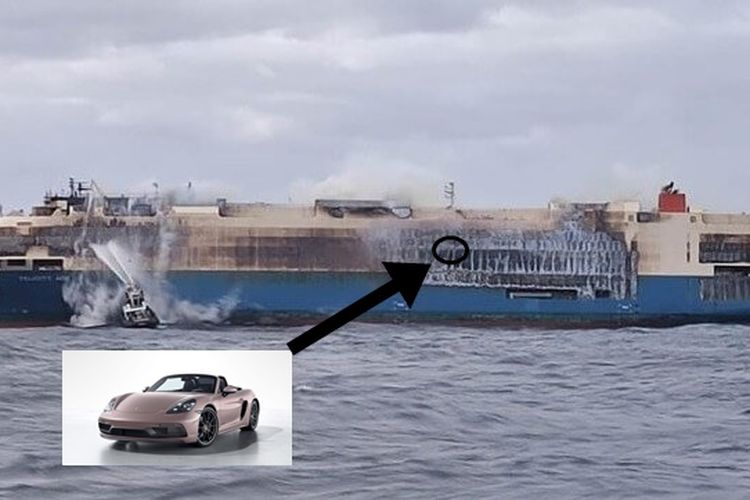 Kapal kargo pengangkut ribuat unit mobil terbakar di tengah laut. Porsche Boxster Spyder dan ribuan mobil lainnya pun mangkrak di tengah laut tuh.