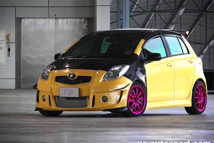 Modifikasi Toyota Yaris bakpao asal Thailand, tampil racing dengan dandanan nyentrik, pasang pelek warna pink dan bodi kuning mustar