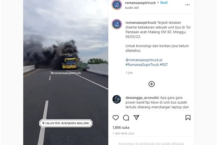 Sebuah bus Al Mubarok meledak dan terbakar di Tol Pandaan arah Malang KM 60 pada Minggu (6/3/2022). Penumpang histeris