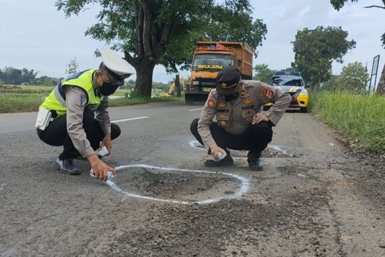 Satlantas Polres Majalengka mencorat-coret jalan berlubang sebagai tanda untuk pengguna jalan guna hindari kecelakaan