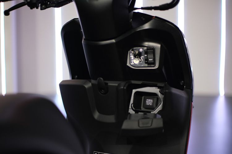 Kini terletak di laci depan, power charger New Honda Genio masih secara spesifikasi masih sama dan butuh adapter tambahan untuk mengisi ulang daya.