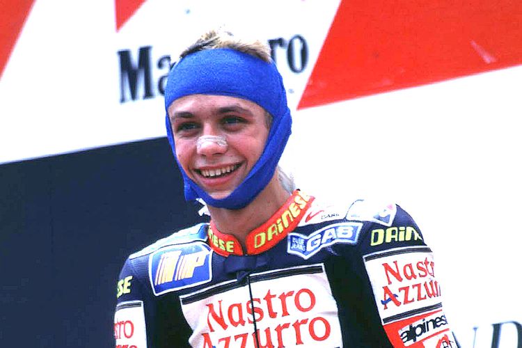 Valentino Rossi sempat memenangkan balapan di GP Indonesia 1997, melakukan selebrasi memakai perban berwarna biru di podium.