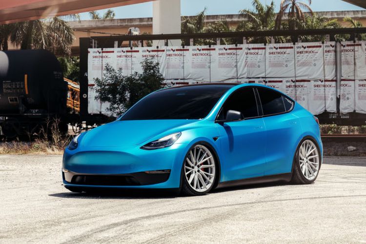 Modifikasi Tesla Model Y tampil bagged berkaki-kaki kandas pasang pelek Vossen dan jubah biru bikin segar.