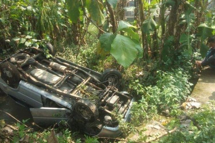 Sebuah Toyota Kijang menabrak tiang dan berakhir terbalik di Mojokerto lantaran sopir mendapati ada kalajengking di pahanya