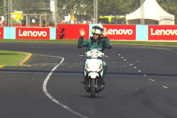 Sebastian Vettel melakukan aksi unik berkeliling sirkuit Albert Park dengan menaiki Suzuki Address usai F1 Australia 2022.