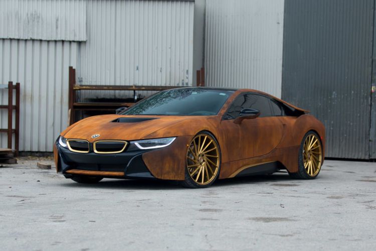 Modifikasi BMW i8 adopsi gaya rusty dengan balutan wrapping sticker karatan yang unik dan ganti pelek Vossen warna emas. Simak ulasannya