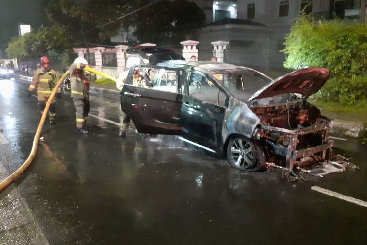 Sebuah Mitsubishi Xpander terbakardi bilangan Pondok Indah, Jakarta Selatan, Jum'at (22/4/2022). Ini kronologinya