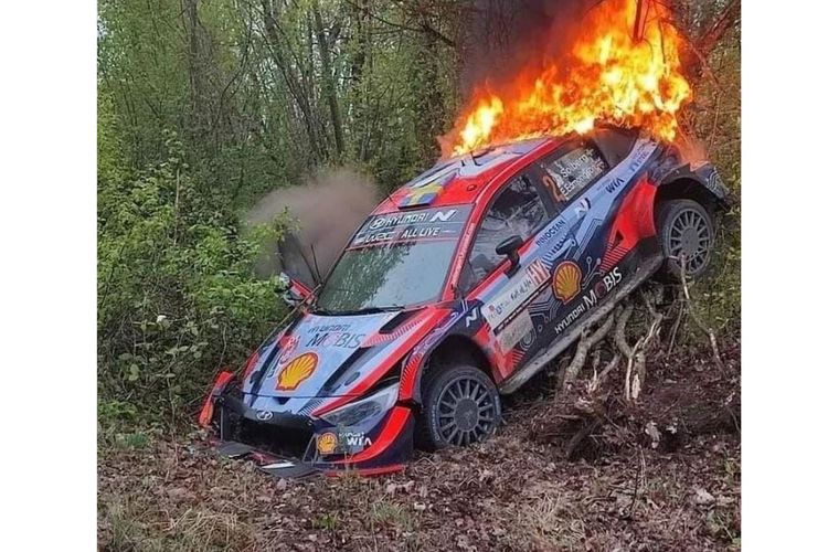 Mobil Hyundai i20 N Rally 1 terbakar setelah keluar dari lintasan pada hari kedua Reli Kroasia 2022, Sabtu (23/4).