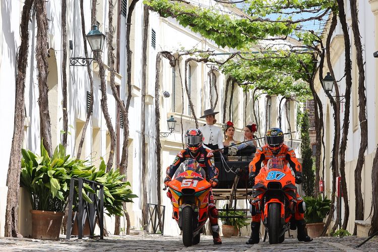 Remy Gardner dan Pedro Acosta melakukan aksi unik menjadi penarik delman jelang dimulainya MotoGP Spanyol 2022 akhir pekan ini.
