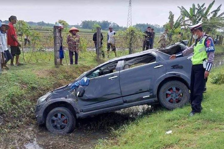 Daihatsu Terios Nyungsep di Parit Akibat Pecah Ban di Tol Kertosono-Ngawi, Bodinya Ringsek Parah