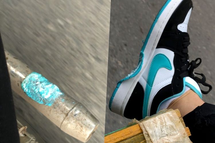 Asli ngenes banget sih. Gara-gara enggak sengaja nempel ke knalpot, sepatu Nike Air Jordan 1 ini berakhir jadi begini.