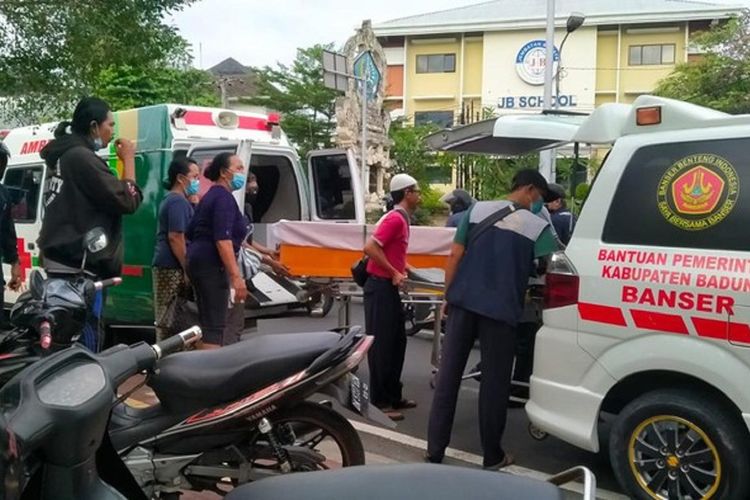 Sebuah kecelakaan lalu lintas melibatkan motor dan mobil ambulans terjadi di Jalan Sunset Road, Kota Denpasar, Bali.