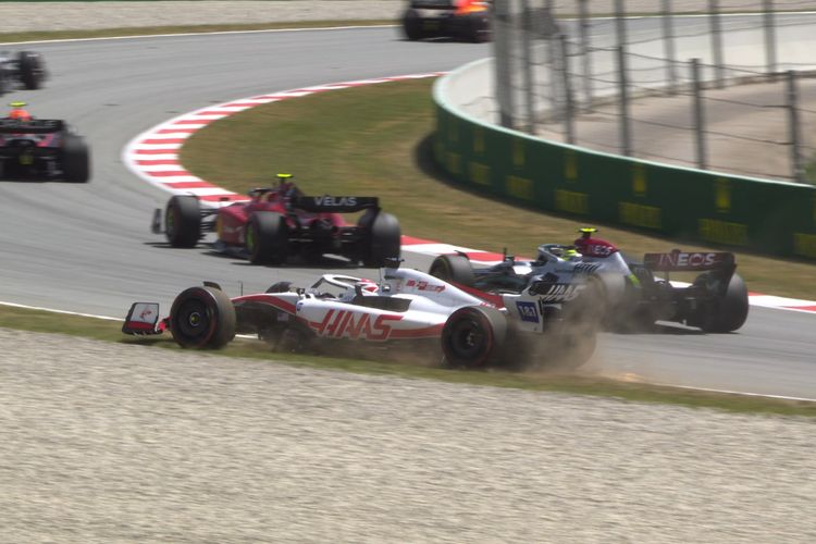 Lewis Hamilton dan Kevin Magnussen terlibat insiden di lap pertama balapan F1 Spanyol 2022, posisi keduanya turun drastis.