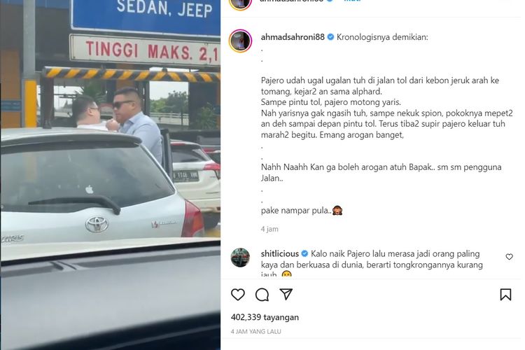 video memperlihatkan pengemudi Pajero yang memakai kacamata hitam tersebut menarik kerah baju pengendara Yaris di depan gerbang tol sambil berteriak.