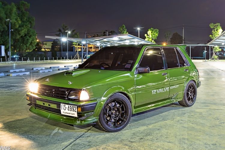 Modifikasi Toyota Starlet kotak asal Thailand ini sukses tampil sangar bergaya racing dengan bodi hijau dan setup kaki-kaki agresif. Simak ulasannya