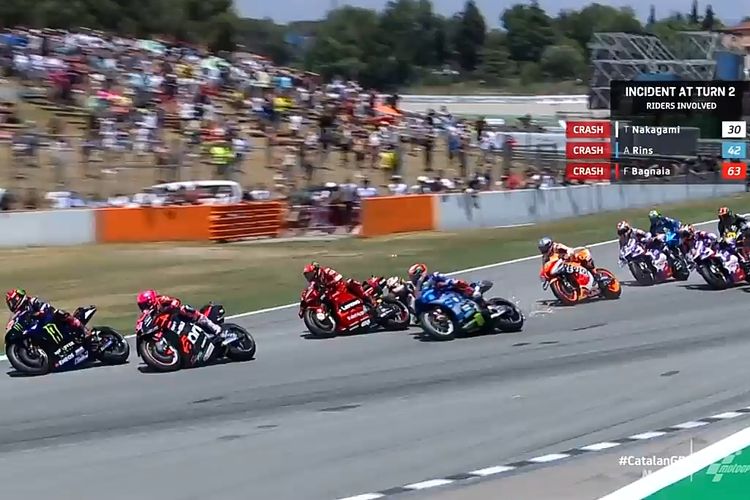 Crash terjadi pada lap pertama MotoGP Catalunya 2022, melibatkan Takaaki Nakagami, Alex Rins dan Pecco Bagnaia.