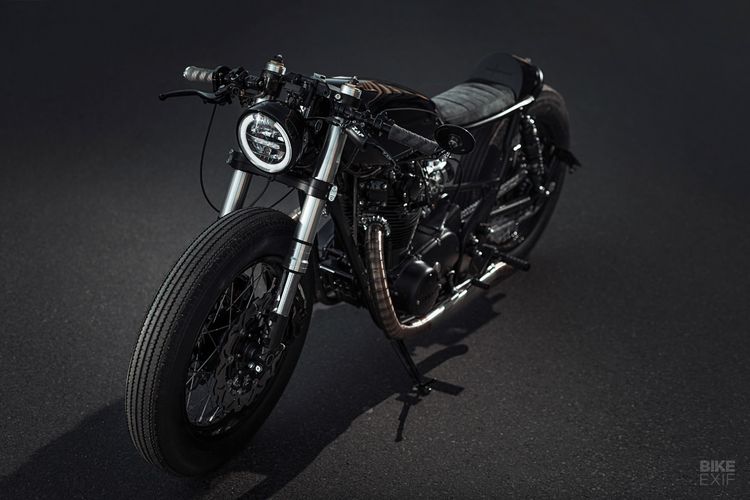 Yamaha XS650 ini tampil sangar dan macho setelah dirombak menjadi cafe racer dengan tampilan serba hitam.