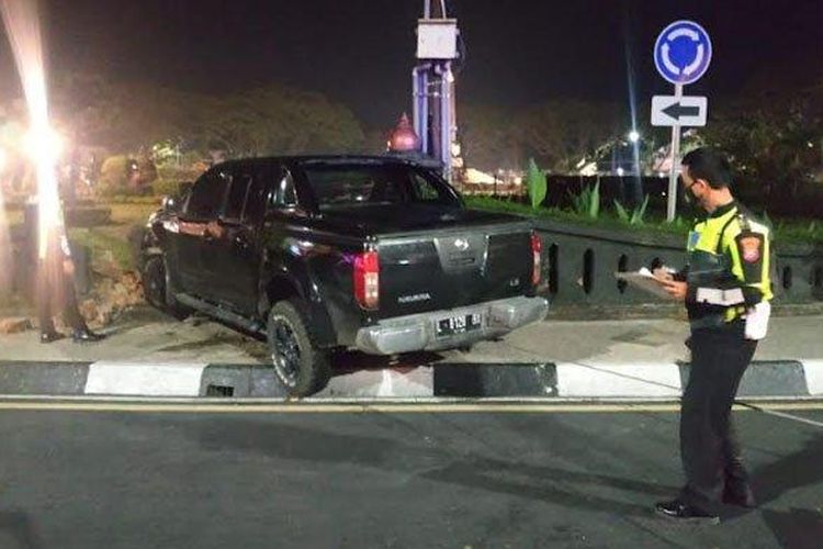 Gara-gara sopir mengantuk, Nissan Navara seruduk tembok alun-alun Tugu Kota Malang pada pada Rabu (08/06).