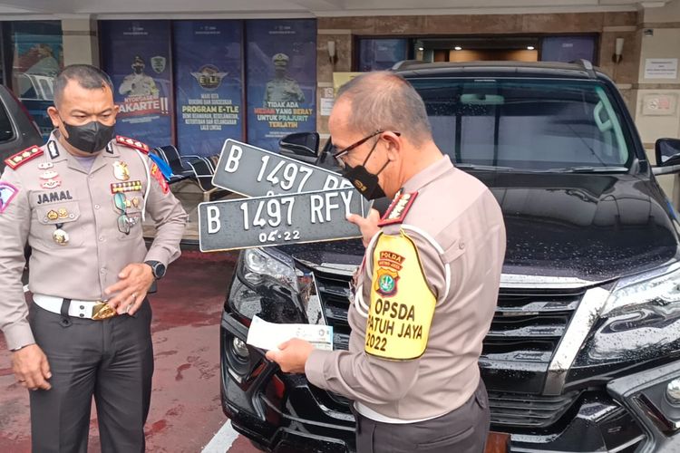 Pihak kepolisian tangkap pelat B 1497 RFY yang menerobos jalur busway dan menggunakan rotator di kawasan Ragunan, Jakarta Selatan..