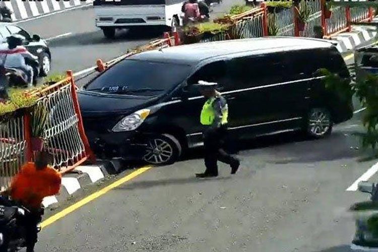 Pengemudi Hyundai H-1 berseragam cokelat mirip Polisi tabrak pembatas di Jalan Wonokromo, Surabaya. Honda BeAT di belakangnya masuk kolong
