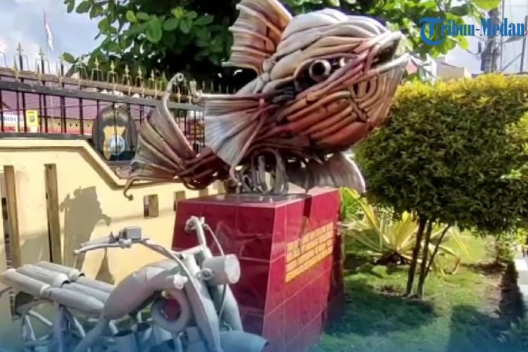Ketimbang dibuang, ratusan knalpot sitaan pun dimanfaatkan Polres Tanjung Balai untuk dibuat jadi tugu ikan dan motor. Hasilnya begini sob.